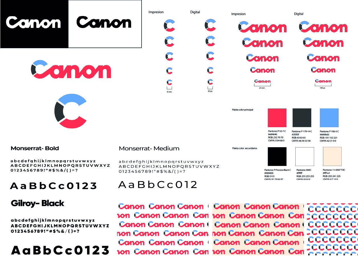 Rediseño de Canon desarrollado como proyecto grupal, con el objetivo de crear una identidad visual más moderna basada en formas redondeadas y representar sus principales áreas: cámaras, impresión y dispositivos médicos.